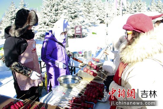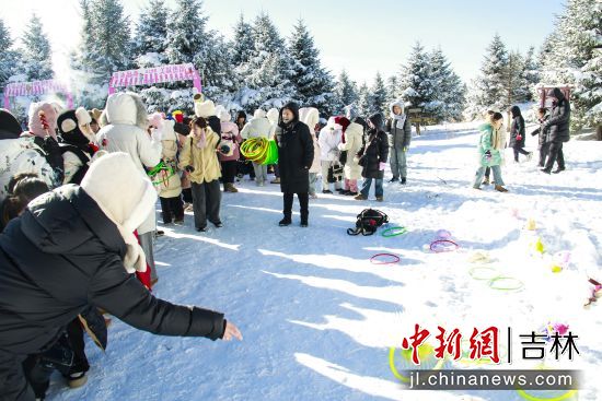 啟動儀式后,現(xiàn)場舉行了豐富的互動體驗活動,包括民族歌舞快閃、吉他彈唱等演出,剪紙、鐵藝、糖人等非遺技藝展示,以及雪地拔河、趣味套圈等冰雪游戲。此外,參雞湯、關(guān)東煮等特色美食也為游客帶來了溫暖的味覺體驗。游客們還在粉色雪景網(wǎng)紅拍照點和溫馴麋鹿互動區(qū)駐足打卡,定格浪漫瞬間。