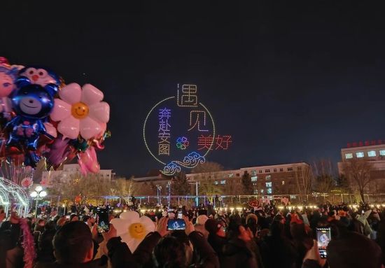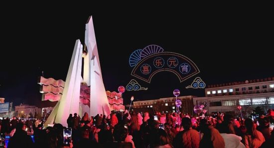 隨后,萬眾期待的無人機表演正式亮相,千余架無人機在夜空中緩緩升空,隨著音樂節(jié)奏不斷變換造型,“元宵”“飛馳的駿馬”“翱翔天空的巨龍”等圖案,“喜樂元宵”“遇見美好奔赴安圖”等字樣在夜空中次第呈現(xiàn),勾勒出唯美浪漫的立體畫面,引得現(xiàn)場觀眾紛紛舉起手機,記錄下這一震撼而美好的瞬間。
