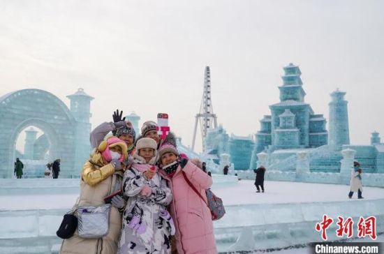 1月4日,第25屆哈爾濱冰雪大世界內(nèi)的冰雕吸引游客觀看。白天的冰雪大世界,游客仿佛置身現(xiàn)實版“冰雪奇緣”。圖為來自北京的游客“打卡”拍照。(資料圖)趙宇航 攝