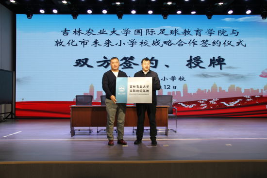 敦化市未來小學校校長吳旭晶同志致歡迎詞。隨后,吉林農(nóng)業(yè)大學國際足球教育學院副書記趙立剛同志講話,介紹本次合作將以校園足球發(fā)展為核心,以課程共建與師資培訓為重點,著力構(gòu)建校地協(xié)同的長效機制。儀式現(xiàn)場,敦化市教育局與吉林農(nóng)業(yè)大學國際足球教育學院簽署了《校外實踐教學基地共建協(xié)議書》,吉林農(nóng)業(yè)大學國際足球教育學院張志成院長授牌。授牌結(jié)束后,吉林農(nóng)業(yè)大學國際足球教育學院向未來小學捐贈了足球訓練裝備,以實際行動為校園足球發(fā)展助力。與此同時,學校向長期支持教育的企業(yè)代表贈送錦旗,企業(yè)代表分享了助力教育發(fā)展的理念。