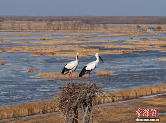 3月16日,吉林鎮(zhèn)賚,一對東方白鸛在莫莫格濕地的巢中休憩!∨岁申 攝