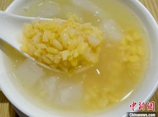 “世界糖水在中國(guó),中國(guó)糖水在廣東。”對(duì)廣州人而言,在炎熱的夏日或寒冷的冬夜,與好友相約糖水鋪,“食”上一碗滋補(bǔ)的糖水,甜蜜就能讓整個(gè)人“充滿電”。圖為馬蹄綠豆爽。 中新社記者 王堅(jiān) 攝