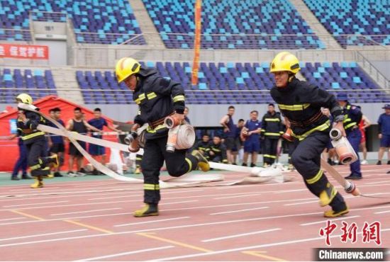 消防指戰(zhàn)員在進行二人五盤水帶連接操!埇 攝