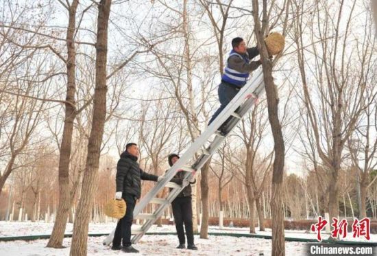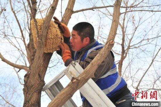 11月23日,趁著雪后天晴,吉林長(zhǎng)春友誼公園的工作人員忙著維護(hù)樹上的草編鳥巢,并投放了鳥糧。該公園生態(tài)環(huán)境好、野生鳥類多,園方已經(jīng)連續(xù)三年在園區(qū)設(shè)置百余個(gè)草編鳥巢助鳥類安全過(guò)冬。