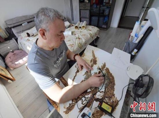 4月3日,吉林長(zhǎng)春,56歲的長(zhǎng)春市民王巖在工作室進(jìn)行烙畫創(chuàng)作。自幼熱愛繪畫的王巖,在機(jī)緣巧合下接觸到烙畫技藝,從此便悉心鉆研。烙畫又稱火筆畫,是指用火燒烙鐵在物體上熨出烙痕作畫的一項(xiàng)技藝。