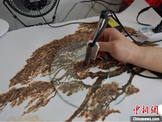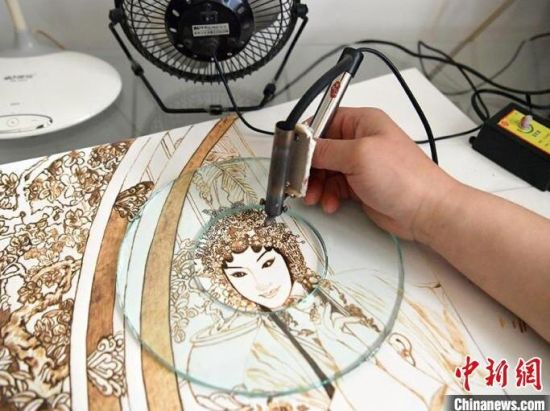 王巖正在創(chuàng)作烙畫作品。
