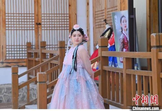 在吉林省延邊州延吉市的中國(guó)朝鮮族民俗園內(nèi),游客身著朝鮮族服飾拍照。張瑤 攝