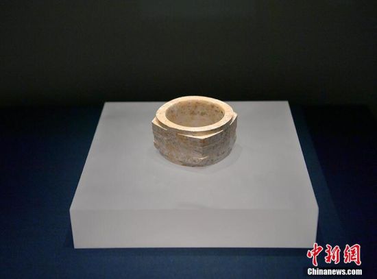 工作人員展示新時期時代良渚文化玉琮(仿制品)。
