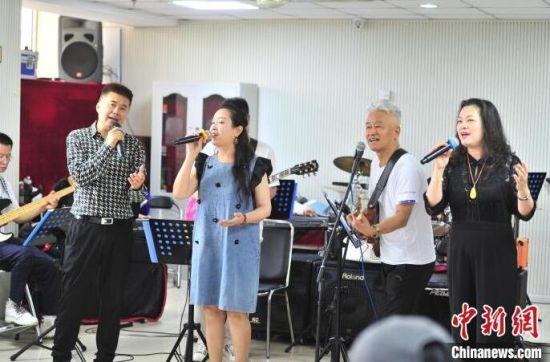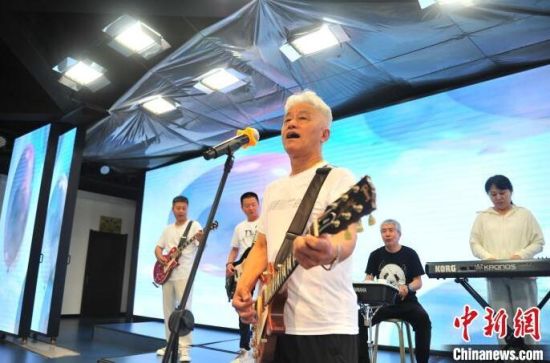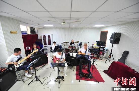7月4日,吉林長春,火焰老年樂隊(duì)在演奏搖滾樂。這支樂隊(duì)有7名樂手和7名主唱,平均年齡62歲,是吉林省為數(shù)不多的老年搖滾樂隊(duì)。他們?cè)诩ぐ旱臉仿曋袑?shí)現(xiàn)自己的搖滾夢(mèng),尋回年輕的感覺。