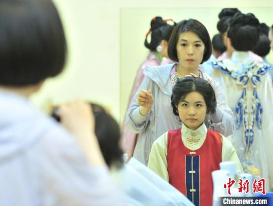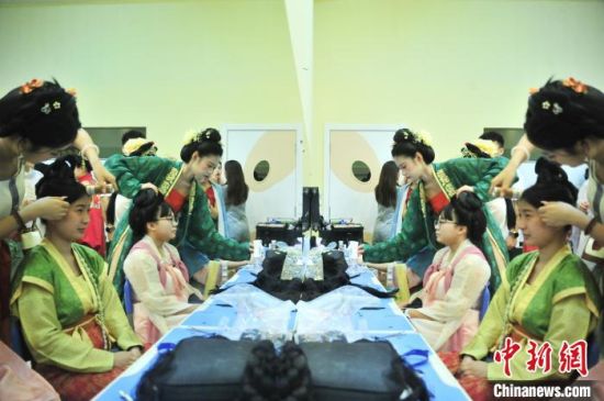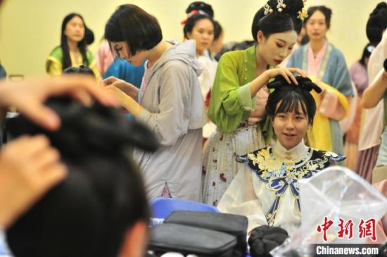 7月9日,吉林四平,2024年全國(guó)臺(tái)聯(lián)第二十一屆臺(tái)胞青年千人夏令營(yíng)吉林分營(yíng)的30余位臺(tái)胞青年參加傳統(tǒng)文化講座,學(xué)習(xí)漢服禮儀、漢服種類劃分等知識(shí),并第一次穿上漢服進(jìn)行體驗(yàn),感受傳統(tǒng)文化之美。圖為臺(tái)胞青年在進(jìn)行漢服妝造。