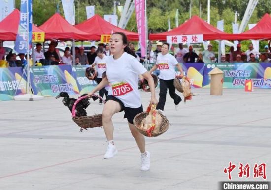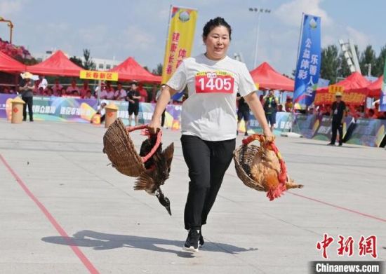 8月16日,吉林長(zhǎng)春,農(nóng)民趣味運(yùn)動(dòng)會(huì)在長(zhǎng)春農(nóng)博園精彩上演,運(yùn)動(dòng)會(huì)設(shè)置了“喜獲豐收”“回娘家”“農(nóng)田大力士”等充滿(mǎn)鄉(xiāng)村特色的比賽項(xiàng)目。圖為選手在“喜獲豐收”比賽中。中新社記者 張瑤 攝