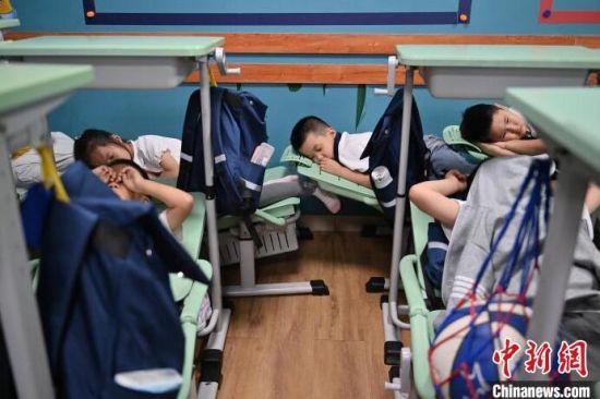 9月5日,在長春南湖實驗中海小學(xué),學(xué)生們在“可躺式”課桌椅上午睡。目前,吉林省有多所學(xué)校已啟用“可躺式”課桌椅,學(xué)生們中午可以躺著休息。中新社記者 張瑤 攝