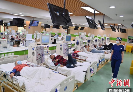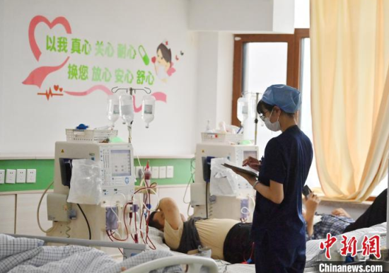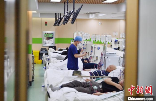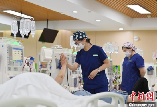 5月9日,長(zhǎng)春中醫(yī)藥大學(xué)附屬醫(yī)院腎病科透析室內(nèi),護(hù)士在為患者進(jìn)行透析治療。該科室日均接診近200名患者,每位患者的透析過程都需要數(shù)小時(shí)。治療期間,護(hù)士們會(huì)全程密切監(jiān)測(cè)患者生命體征,隨時(shí)準(zhǔn)備應(yīng)對(duì)突發(fā)狀況。多年來,醫(yī)護(hù)團(tuán)隊(duì)以專業(yè)的技能和細(xì)致的關(guān)懷,持續(xù)為患者的生命健康保駕護(hù)航。中新社記者 張瑤 攝