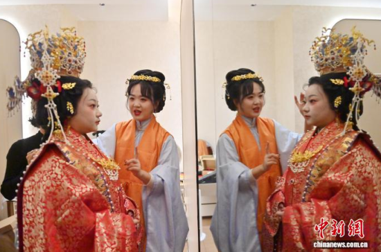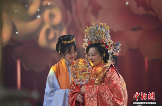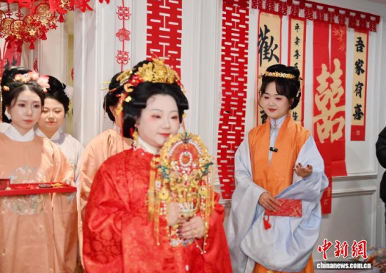 1月9日,吉林長(zhǎng)春,任鴻洋(右)手持熏香入場(chǎng)。長(zhǎng)春“00后”女孩任鴻洋是一位漢服愛(ài)好者,出于對(duì)傳統(tǒng)文化的熱愛(ài),她成為一名執(zhí)禮喜娘。她已為50多對(duì)新人舉辦中式婚禮,通過(guò)優(yōu)雅的古典儀式,不僅推廣傳統(tǒng)婚俗,更致力于傳播漢服文化。她希望以年輕的方式,讓千年“中式浪漫”在現(xiàn)代生活中煥發(fā)新光彩。中新社記者 張瑤 攝