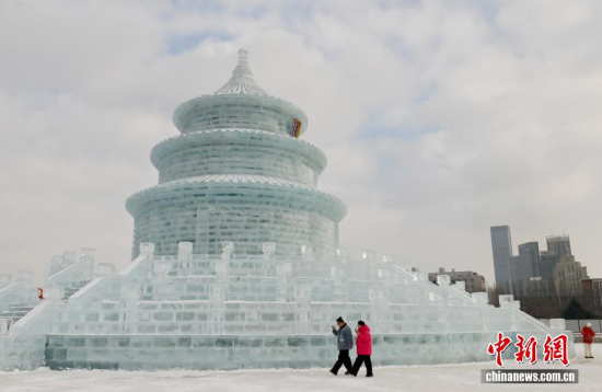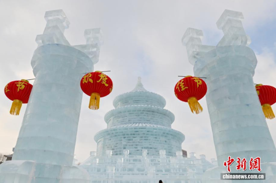 1月12日,在長春市的文化廣場上,一座以北京天壇祈年殿為原型的巨型冰雕成為冬日一景。冰雕高約21米,用冰量5010立方米,飛檐、殿頂?shù)葌鹘y(tǒng)建筑細(xì)節(jié)均被精準(zhǔn)復(fù)刻,陽光下晶瑩剔透,配合紅燈籠冰柱點(diǎn)綴,盡顯中式浪漫韻味,吸引眾多游客前來拍照打卡。中新社記者 張瑤 攝