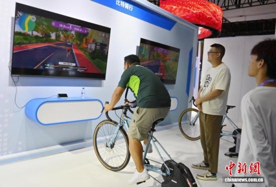 2023年8月24日,吉林長春,市民體驗比特騎行,感受數(shù)智競技運動的樂趣。第十四屆中國—東北亞博覽會首次設置現(xiàn)代裝備與新能源合作主題館,集中展示人工智能平臺、新能源智能轎跑、制氫整流電源等裝備和產(chǎn)品。